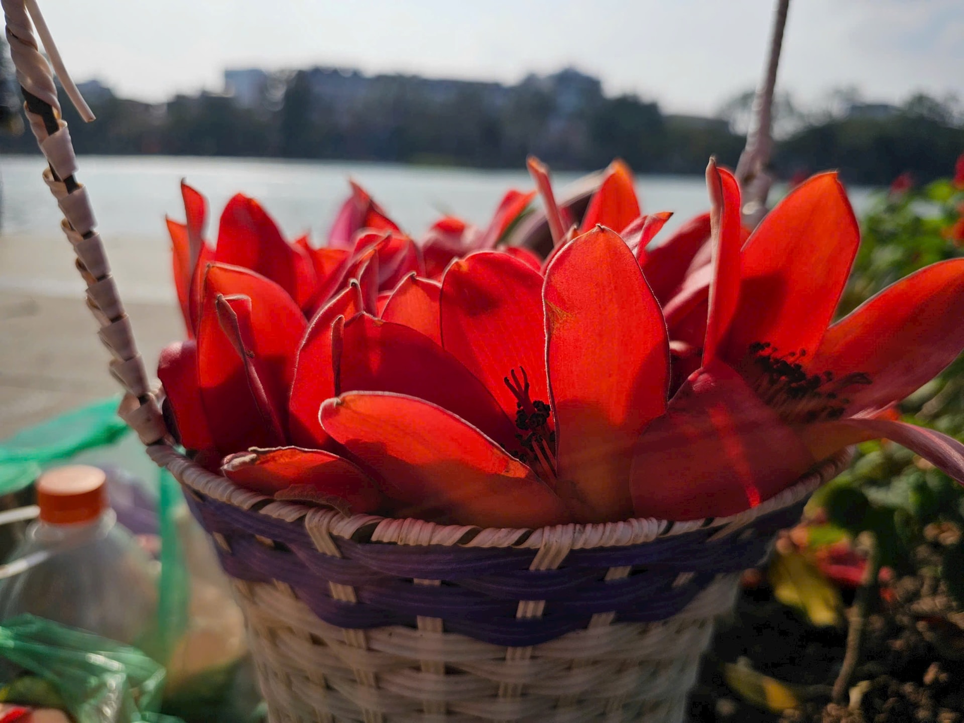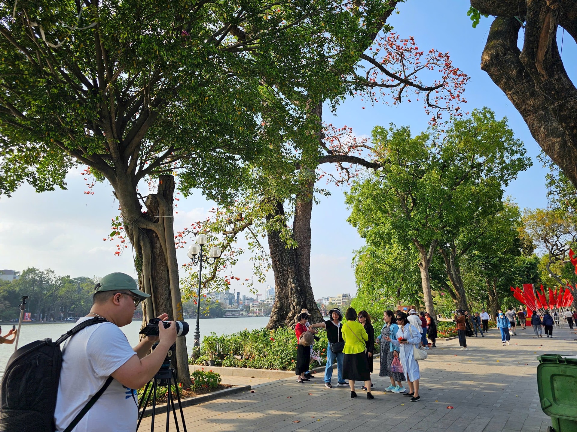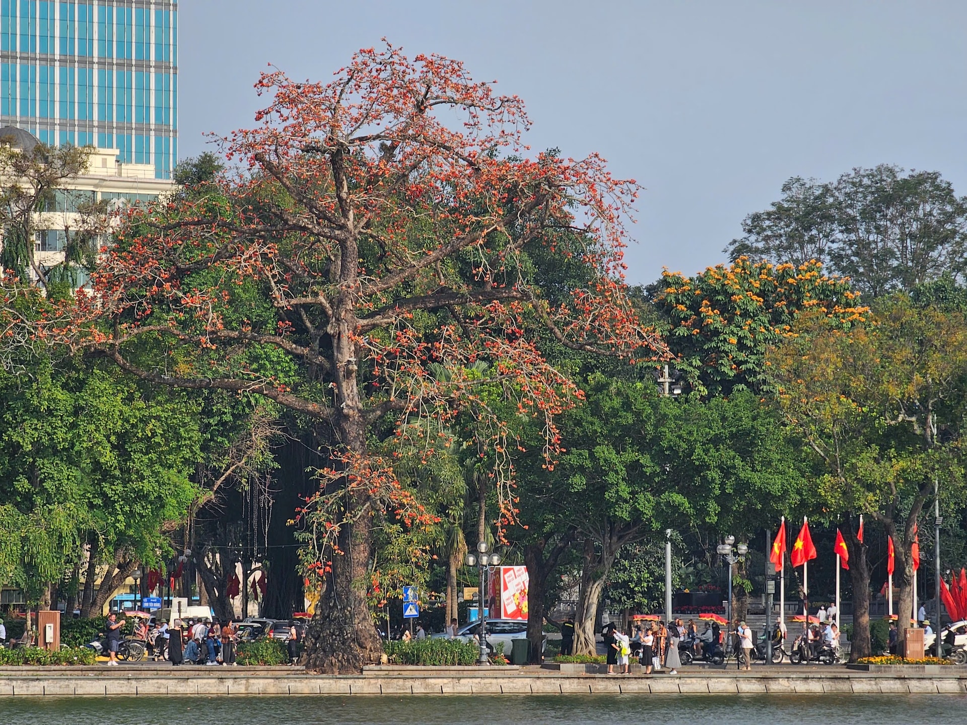 Cây hoa gạo bung nở rực đỏ bên bờ Hồ. Ảnh: TA