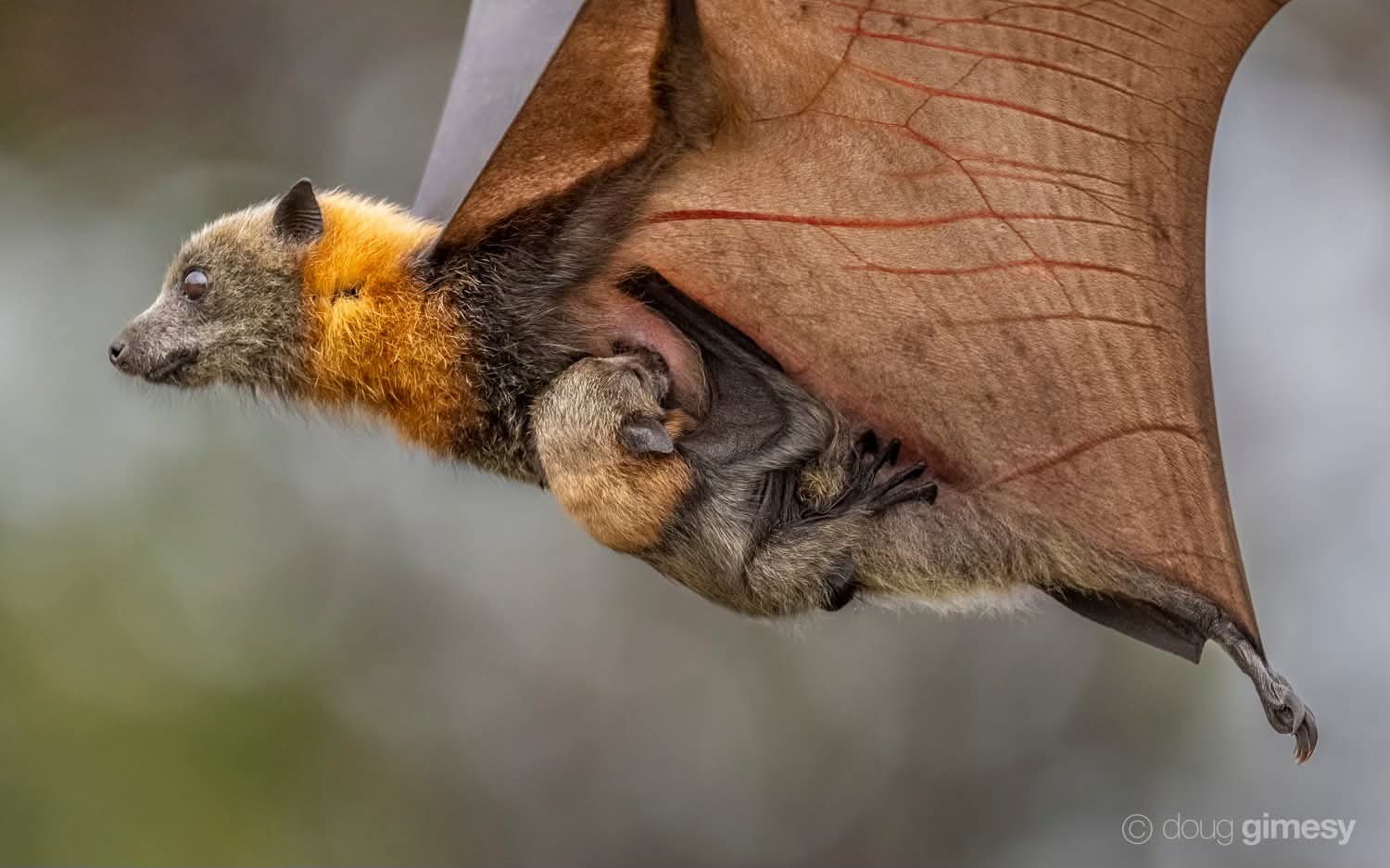 Bức ảnh có tên ‘Baby on board’ (Tạm dịch: Trên chuyến bay có trẻ em) của nhiếp ảnh gia Doug Gimesy, ghi lại khoảnh khắc một nhỏ Cáo bay đầu xám (Grey-headed Flying-fox) ôm con bay giữa những tán cây. Bé con dùng tứ chi ôm ghì lấy bụng mẹ, và để chắc chắn hơn, ẻm còn ngậm thật chặt num’ tee (.) của mẹ nữa